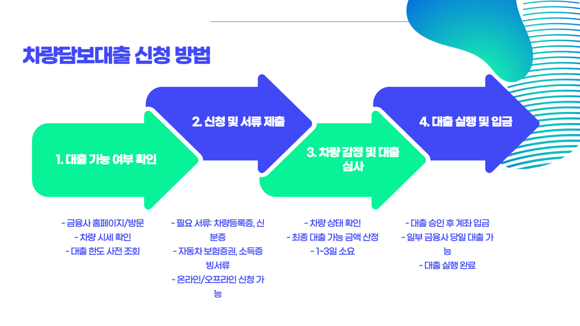 차량담보대출을 신청하는 과정은 간단하며, 다음 절차를 따르면 됩니다.