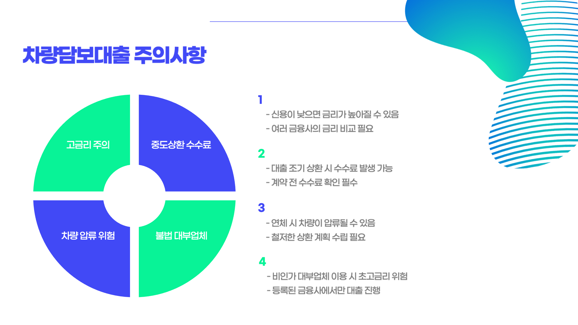 차량담보대출은 신용등급이 낮거나 급하게 자금이 필요한 경우 유용한 대출 상품입니다. 하지만, 대출 금리와 조건을 꼼꼼히 확인하고, 불법 대부업체를 피하는 것이 중요합니다.