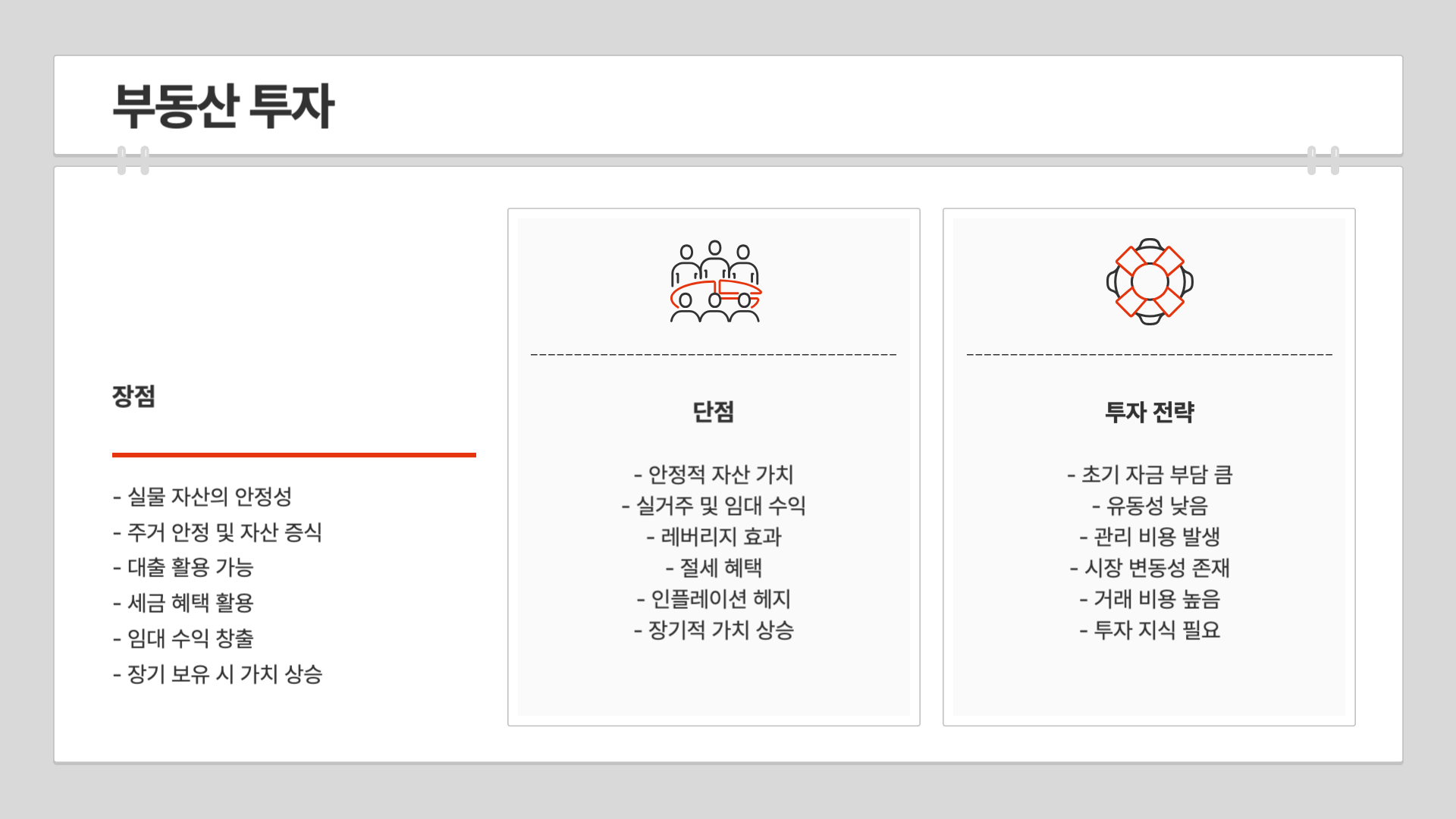 - 레버리지 효과: 주택담보대출을 활용하여 적은 자본으로도 큰 규모의 자산을 확보할 수 있습니다.